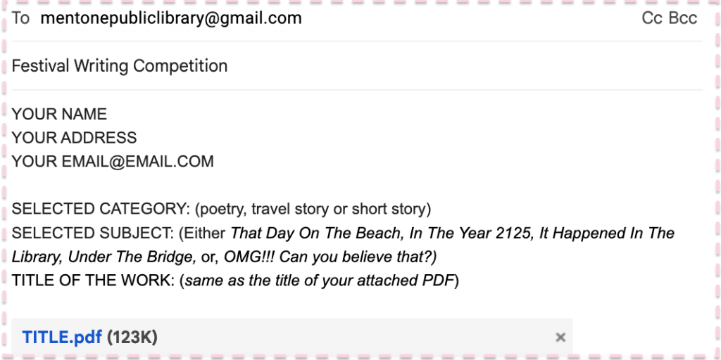 In the email Subject space, write: Festival Writing Competition.